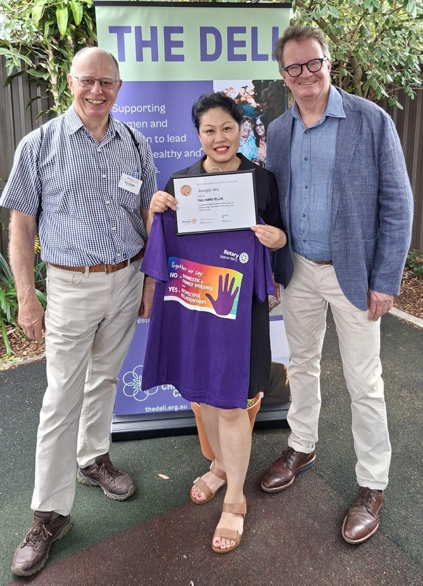 Rotarians often designate a Paul Harris Fellow, named after our founder, Paul Harris, as a tribute to a person whose life demonstrates a shared purpose with the objectives of Rotary, and builds world understanding and peace. It is a well recognised and prestigious award, given to those who have made a sustained and positive impact on their community. Jennifer is a very deserving recipient!